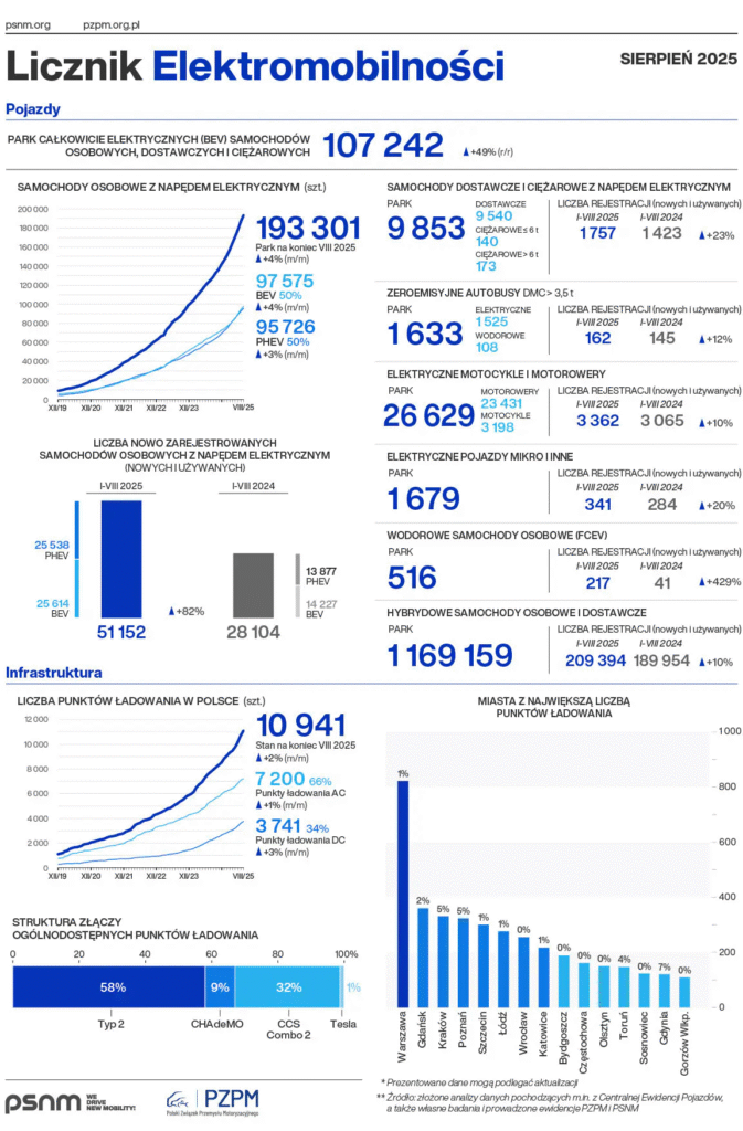 Równolegle do floty pojazdów z napędem elektrycznym rozwija się infrastruktura ładowania. Pod koniec sierpnia 2025 roku w Polsce funkcjonowało 10 941 ogólnodostępnych punktów ładowania pojazdów elektrycznych. 34 procent z nich stanowiły szybkie punkty ładowania prądem stałym o mocy powyżej 22 kilowatów, a 66 procent – wolne punkty prądu przemiennego o mocy mniejszej lub równej 22 kilowatom.